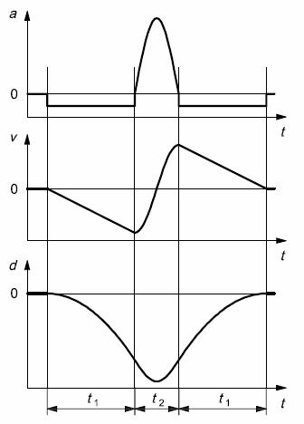 一些别的文献用调节代替补偿。补偿的目的是确保终止的速度和位移为零。下图显示一个在加速度半正弦脉冲添加前和后补偿后的脉冲波形。
