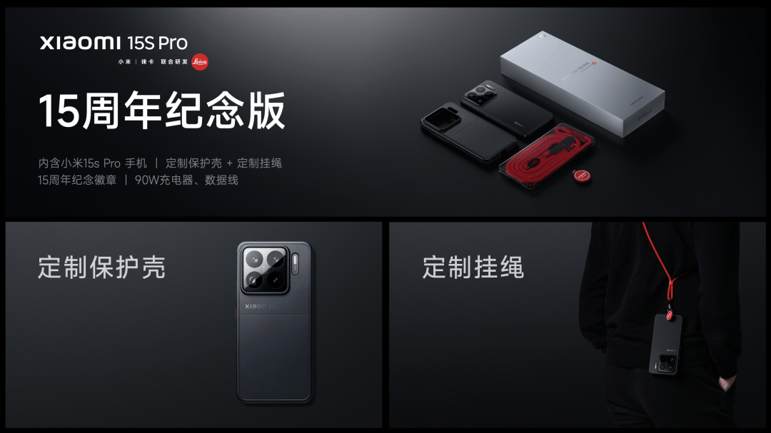 此外,我们还为小米15S Pro 打造了专属 15 周年设计:小米龙鳞纤维版采用烫金工艺 Logo,和电源按键的金色点缀交相呼应;闪光灯处添加了 XRING 自研芯片的专属徽印。还有 15 周年专属开机动画、全新壁纸、特别版包装、定制手机壳和明艳的红色定制挂绳、15 周年纪念徽章等,非常有纪念意义。