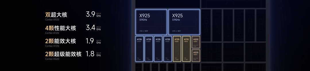 玄戒O1 的 CPU 采用 10 核 4 丛集架构,拥有两颗 Arm 最新最强的 Cortex-X925 超大核,四颗最新的 A725 性能大核、两颗低频 A725 能效大核和两颗 A520 超级能效核心,可以很好的兼顾峰值爆发性能和日用能效。