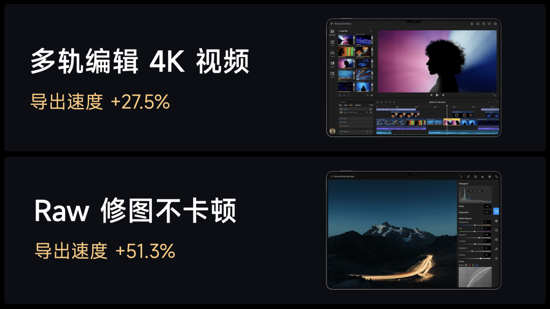 专业创作场景也能轻松胜任,4K 多轨视频剪辑导出速度提升接近 30%、200 兆超大 RAW 图修图导出提升 50%。