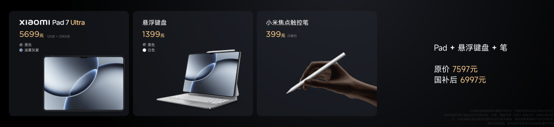 专业生产力配件,悬浮键盘 1399 元,焦点触控笔建议零售价 499 元,现闪降优惠价 399 元。三个成套组购买,建议零售价 7597 元起,平板享受国补、触控笔闪降优惠后 6997 元起,欢迎大家选购。