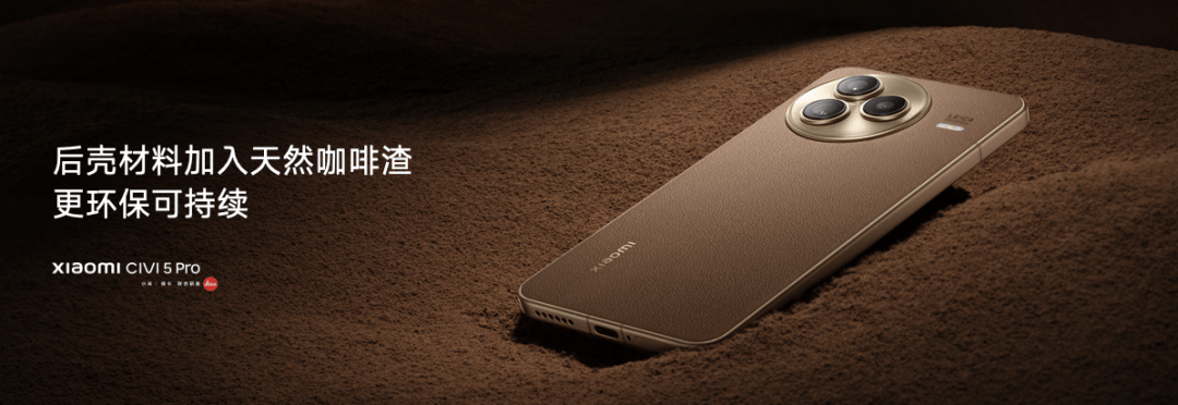 小米Civi 5 Pro 还有「冰美式」特别版,创新采用咖啡皮基底环保工艺,将天然咖啡渣材料加入手机后壳,更环保可持续。咖啡素皮与金色中框、摄像头模组绝妙碰撞,优雅高级。