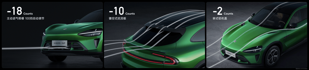 小米YU7 全车做了 40 多处风阻优化,风阻系数优化到 0.245,相当于 CLTC 续航增加 59km。还拥有 10 组贯穿式风道、19 个风口来梳理全车气流。