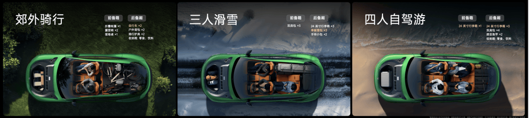比如,两个人郊外骑行,你可以带两辆自行车加全套露营装备;周末三个朋友去滑雪,你可以带 3 套滑雪板和行李;四个人自驾游,可以带 4 个 24 英寸行李箱、4个背包,非常轻松。