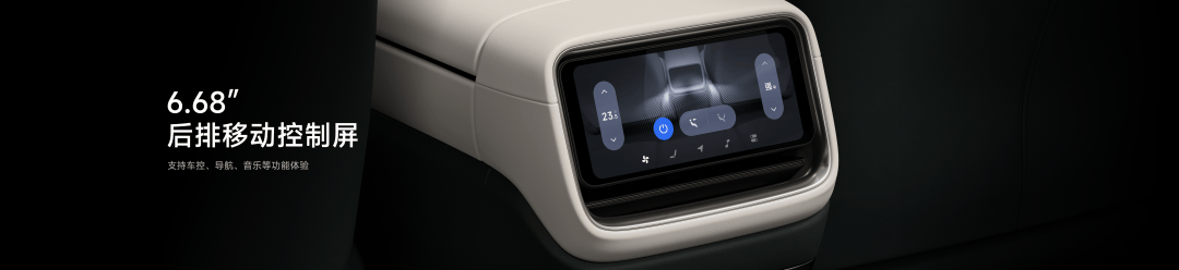后排新增了一块 6.68 英寸的移动控制屏,后排人员也可以用它控车、导航、调音乐。