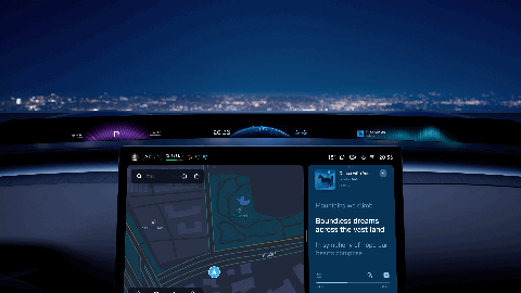三块 Mini LED 屏幕,通过全景曲面投影技术,反射在前风挡下黑区。拥有 1.1m 超宽显示,超视网膜级的高清显示。