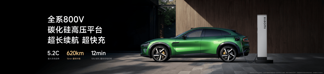 除了续航出色,充电也特别快,小米YU7 全系采用 800V 碳化硅高压平台,Max 版本还支持 5.2C 的最大充电倍率,10-80% 最快 12 分钟,最快15 分钟即可充电 620km。