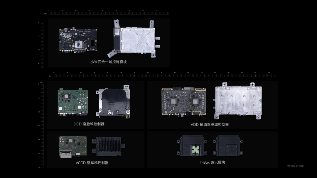 我们在小米YU7 上做了一个四合一的域控制器,相当于一个集成度很高的中央大脑,把辅助驾驶、智能座舱、整车控制器和通讯模块,几十个功能模块都合到了一起,高度集成。(图示仅为示意)