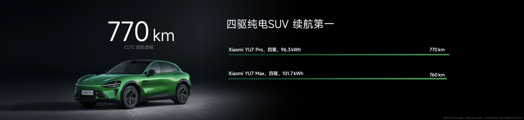 小米YU7 Pro 版,超长续航四驱版,支持 770km 超长续航,在四驱 SUV 中的续航领先。搭载双电机四驱和闭式双腔空簧,零百加速 4.27 秒,拥有更好的驾驶感和通过性,专门给喜欢四驱 SUV 的朋友打造。
