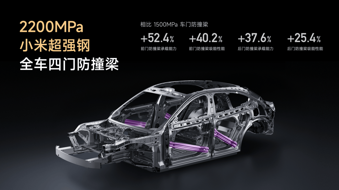 我们和国内知名的科研团队、大学合作开发了 2200MPa 小米超强钢,它是目前汽车行业中最强的热成型钢,使用在四门防撞梁上,能有效提升侧面碰撞中的乘员舱保护,前门防撞梁承载能力提升 52.4%,后门防撞梁承载能力提升 37.6%。