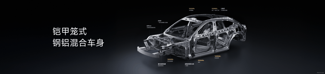 铠甲笼式钢铝混合车身全面升级,车头正面有效吸能空间达到 659mm,拥有更大的缓冲区。车尾则沿用三段式大压铸后地板,非常坚固。底部增加 1500MPa 防刮底横梁,能大幅降低石头刮坏电池包的可能,同时,也采用了小米SU7 Ultra 同款「防弹涂层」,进一步保证电池安全。
