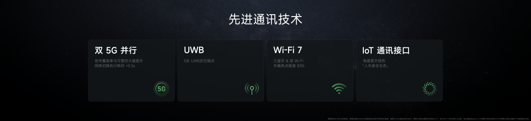 小米YU7 还搭载了很多先进的通讯技术:比如行业领先的双 5G 并行通讯网络、 UWB 近场通讯,无论是小米15S Pro还是苹果手机,都能获得很好的控车体验。