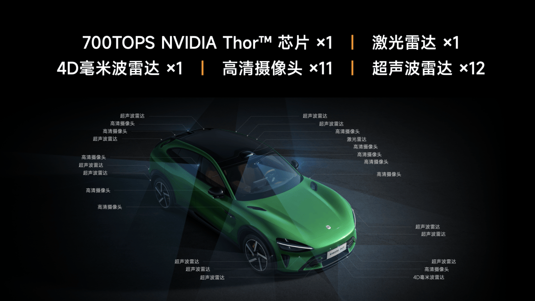小米YU7 辅助驾驶系统全套硬件,配置都非常高,全系标配英伟达 Thor 车载计算平台、1 个激光雷达、1 个 4D 毫米波雷达、11 个高清摄像头以及 12 颗超声波雷达。