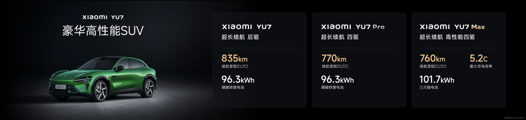 对于纯电 SUV 来说,续航非常重要。同时,从成本角度来看,续航也是整车最贵的配置。小米YU7 一共有三个版本,标准版、Pro 和 Max,全系都是超长续航。其中,标准版就拥有 835km 的超长续航,在中大型纯电 SUV 中续航领先。