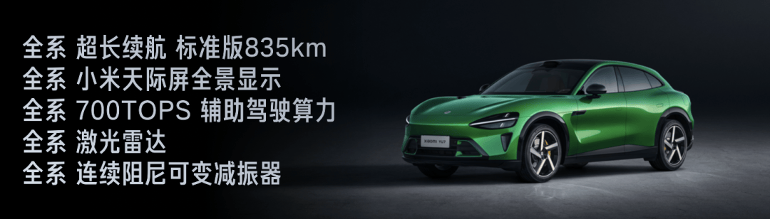 小米YU7 定位为「豪华高性能 SUV」,全系标配非常强大的配置:全系超长续航、全系标配小米天际屏全景显示、全系标配700TOPS 辅助驾驶算力、全系标配激光雷达、全系标配连续阻尼可变减振器。